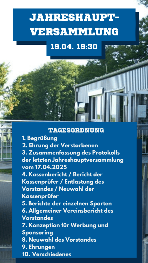 Der Jugend-Förderverein des FA Herringhausen-Eickum e.V. lädt alle Mitglieder herzlich zur Jahreshauptversammlung am Dienstag, den 24. März 2026, um 19:00 Uhr im Vereinsheim am Sportplatz ein. Gemeinsam möchten wir auf das vergangene Vereinsjahr zurückblicken, über aktuelle Entwicklungen berichten und einen Ausblick auf die zukünftige Förderung unserer Jugendabteilung geben. Wir freuen uns über eine rege Teilnahme und einen gemeinsamen Austausch.